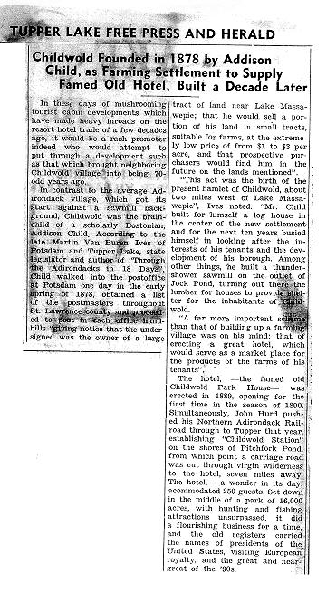 | Article about Childwold's origin in 1878 and history, from the Tupper Lake Free Press and Herald (date unknown) | How Childwold Got Its Name article from The Quarterly of October, 1961, used by permission of the St. Lawrence County Historical Association |