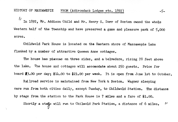 | New January, 2024: 1904 Social Register listing at Childwold Park for Henry Gustavus Dorr (Thanks to Mary Farnham for sending these images.) | 1921 brochure for Camp Mas-sa-we-pie, run by St. John's School, Manlius): Cover Page 1 Page 2 Page 3 Page 4 Page 5 Page 6 Page 7 Page 8 Page 9 Page 10 Page 11 Page 12 Page 13 Page 14 Page 15 Page 16 Page 17 Page 18 Page 19 Page 20 Page 21 Page 22 Page 23 Page 24 |