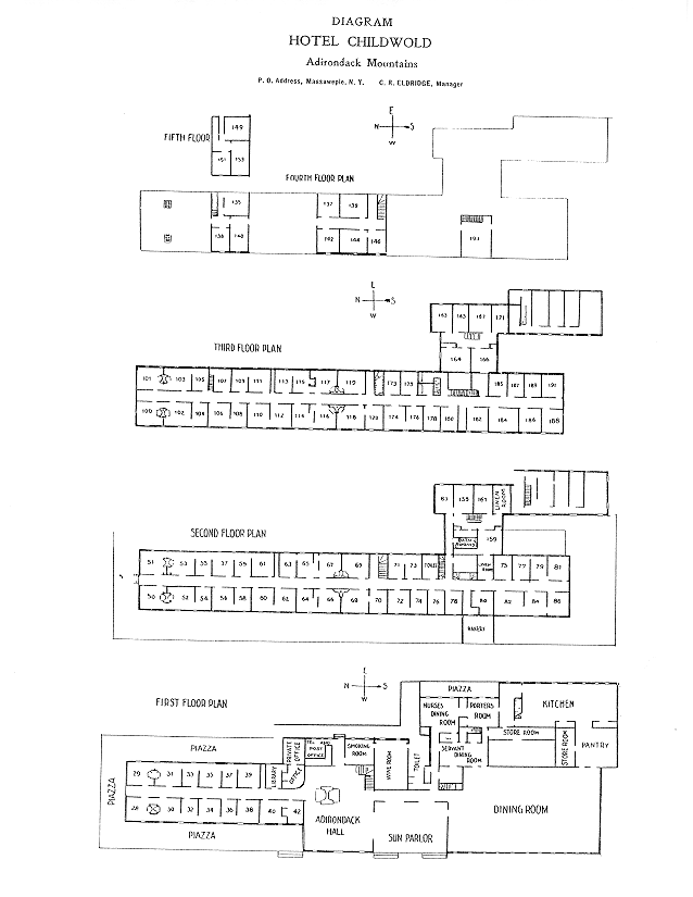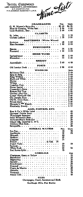 From the Adirondack Museum archives: Hotel Childwold Floor Plan Hotel Childwold Lunch/Dinner Menu for Thursday, August 13, 1903 Hotel Childwold Wine List |