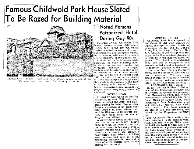 | 1929 Syracuse Herald newspaper article about abandoned Hotel Childwold