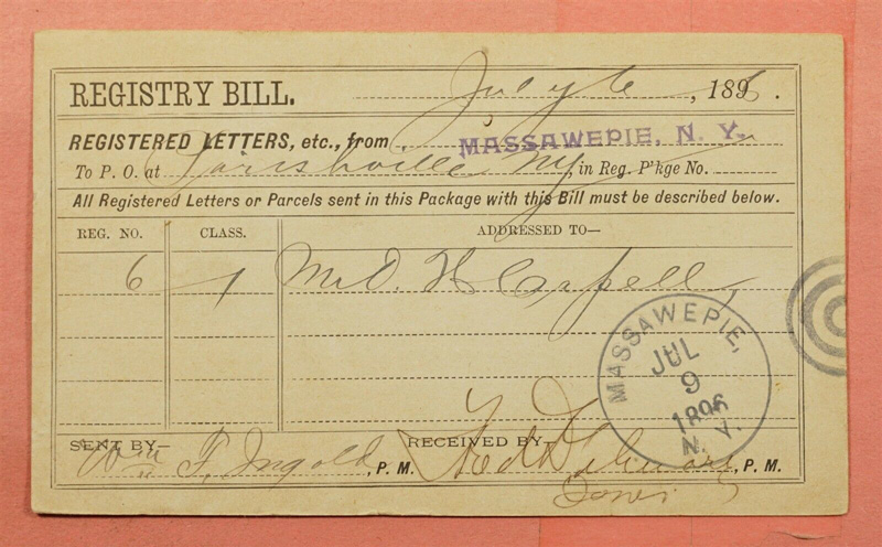 | 1896 Massawepie Post Office Registered Letter Registry signed by William Ingold, Childwold Park House manager: Front side Reverse side, with Massawepie postmark | Advertising Handbill for the Childwold Park House, 1890's(?) |