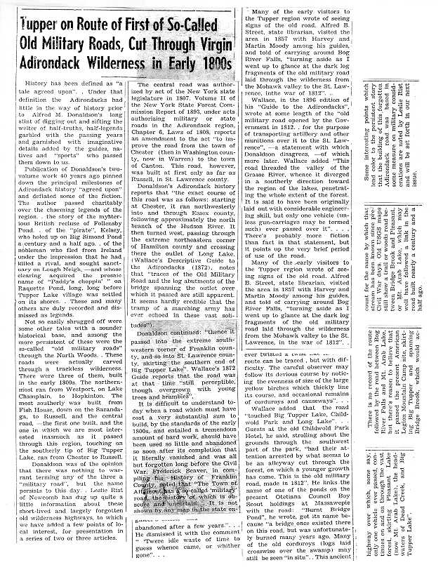 | Newspaper article about impending demolition of Hotel Childwold, 1946 | Article about the Military Road built in the early 1800's near Massawepie, from the Tupper Lake Free Press and Herald (date unknown). Note: The article erroneously states that Burntbridge Pond is on Massawepie property. |