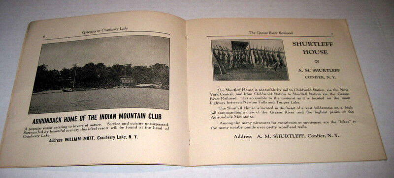 | Mohawk Peter (Cornhill Publishing, Boston, 1921) was written by Henry G. Dorr, who apparently took over the Hotel Childwold after Addison Child's death. This 7-page summary in PDF format includes the tale of the origin of the name "Pontiac Point". | Grasse River Railroad 1922 Advertising Brochure: Cover Map Cranberry Lake Ads Shurtleff House Ad |