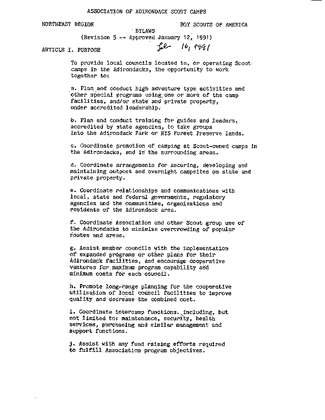 | 1991 bylaws of the Association of Adirondack Scout Camps Page 1 Page 2 Page 3 Page 4 Page 5 | 1997 ASR Promotional Brochure Cover |