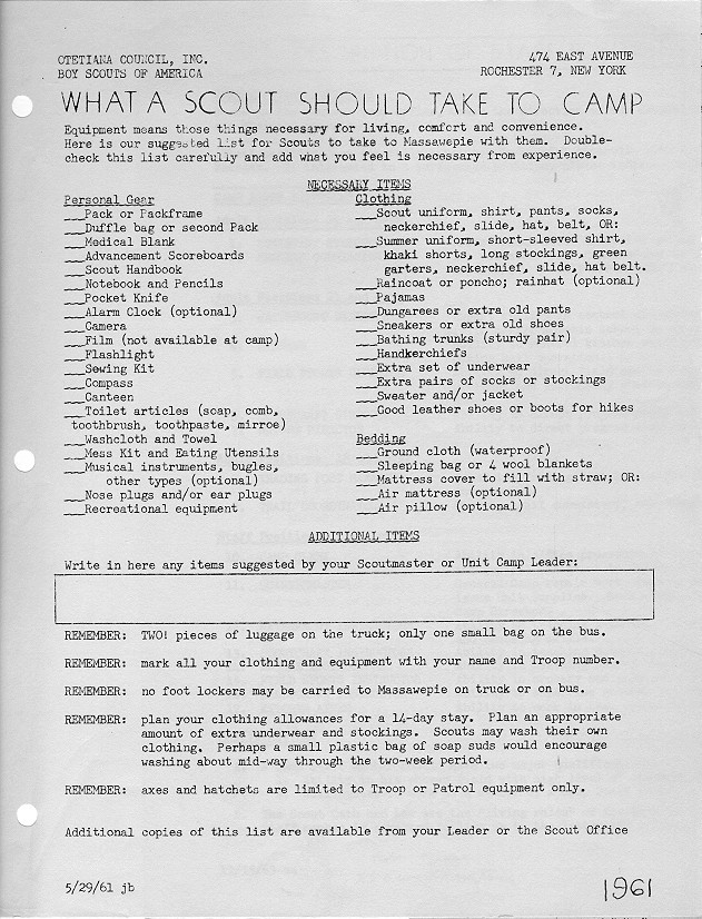 | 1961 "What A Scout Should Take to Camp" | 1964 Staff Contract for Paul Gorski, Pioneer Waterfront Instructor |