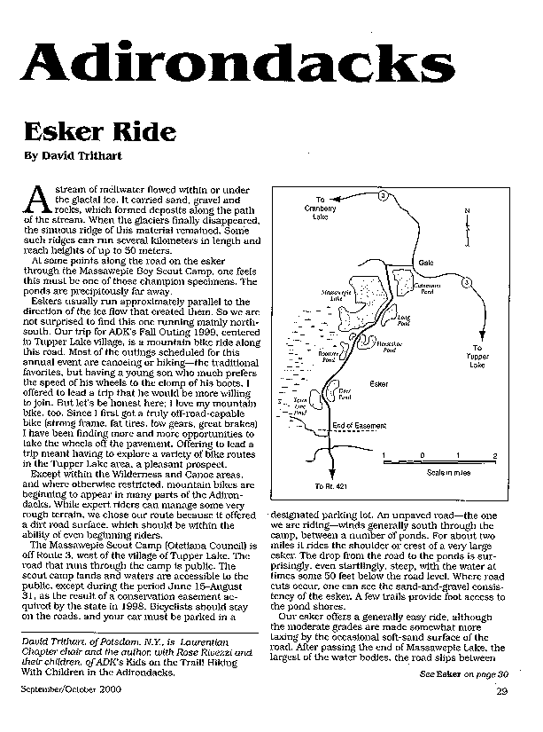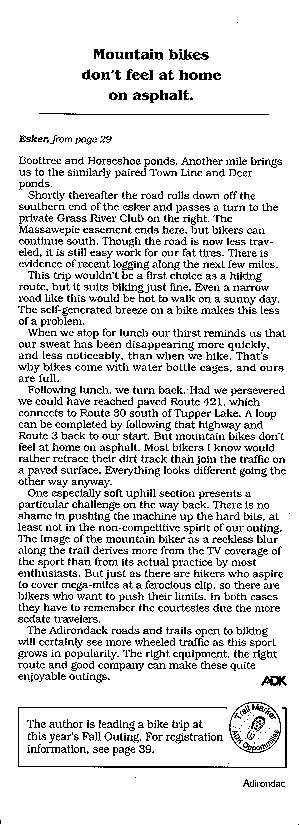 "Esker Ride", an article on cycling in Massawepie, from the Sept./Oct., 2000 issue of Adirondac, the magazine of the Adirondack Mountain Club (copyright 2000, used with permission) Page 1 Page 2 |