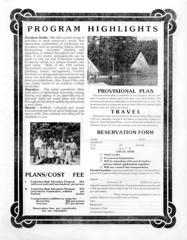 | 1983 Massawepie Promotional Flyer "31 Years of Adventure" Front Reverse | 1983 Explorer High Adventure Camp Flyer Page 1 Page 2 Page 3 Page 4 |