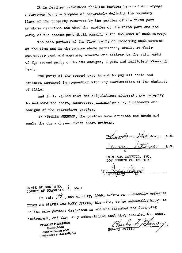| 1965 Staves Property (& cabins, on Catamount Pond) Purchase Agreement Page 1 Page 2 Page 3 Page 4 Page 5 Page 6 | 1969 Cooperative Agreement with NYS Department of Conservation Page 1 Page 2 Page 3 |