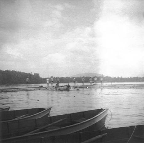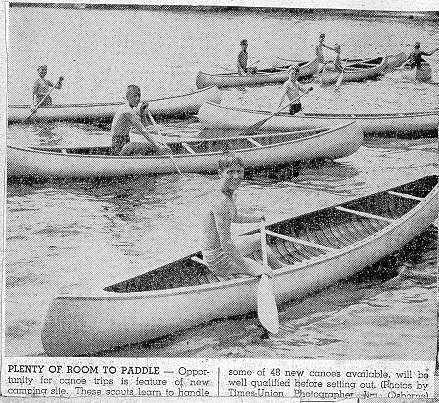 Scouts practice paddling in front of Pioneer boat dock (Newspaper photo) |