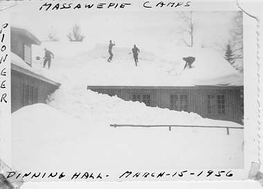 Four men shoveling snow off roof of Pioneer Dining Hall |