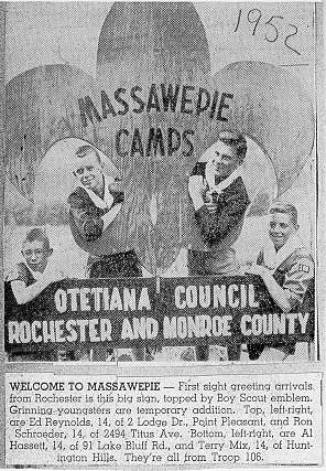 Sign at Massawepie Camp entrance, with Troop 106 Scouts (Newspaper photo) |