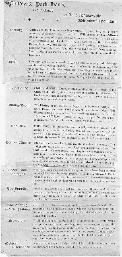 | New January, 2024: Link to Childwold Park House 1891 "Second Season" brochure | Description of Hotel Childwold from Adirondack Lodges, 1892 |