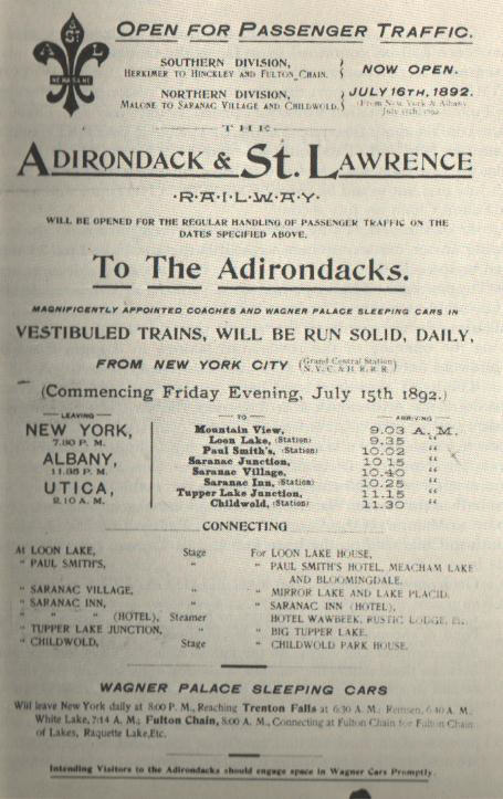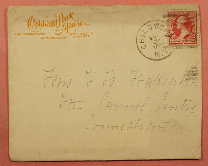 | Flyer for start of service on the Adirondack & St. Lawrence Railway, 7/15/1892: Announcement Schedule (Trains ran N from Childwold Station and S from the Fulton Chain - the middle section of the railroad was not completed until 10/12/1892) | 1894 Childwold Park House Envelope, with Childwold postmark Letter (and envelope) on Childwold Park House stationery, sent to Malone and postmarked at Massawepie on June 17, 1895 |