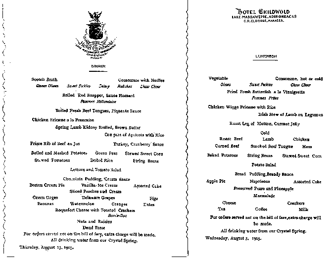 From the Adirondack Museum archives: Hotel Childwold Floor Plan Hotel Childwold Lunch/Dinner Menu for Thursday, August 13, 1903 Hotel Childwold Wine List |