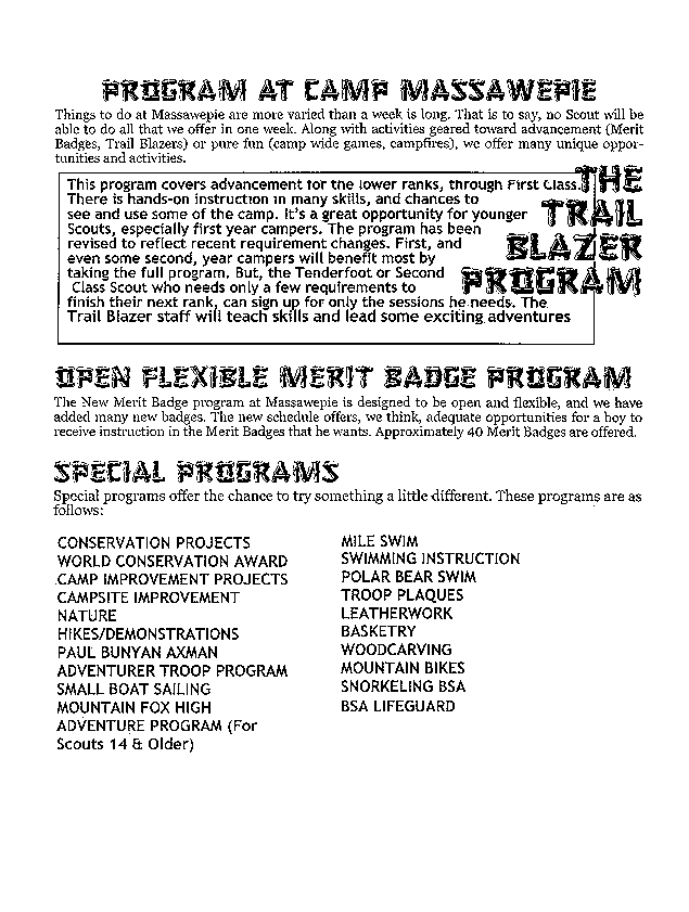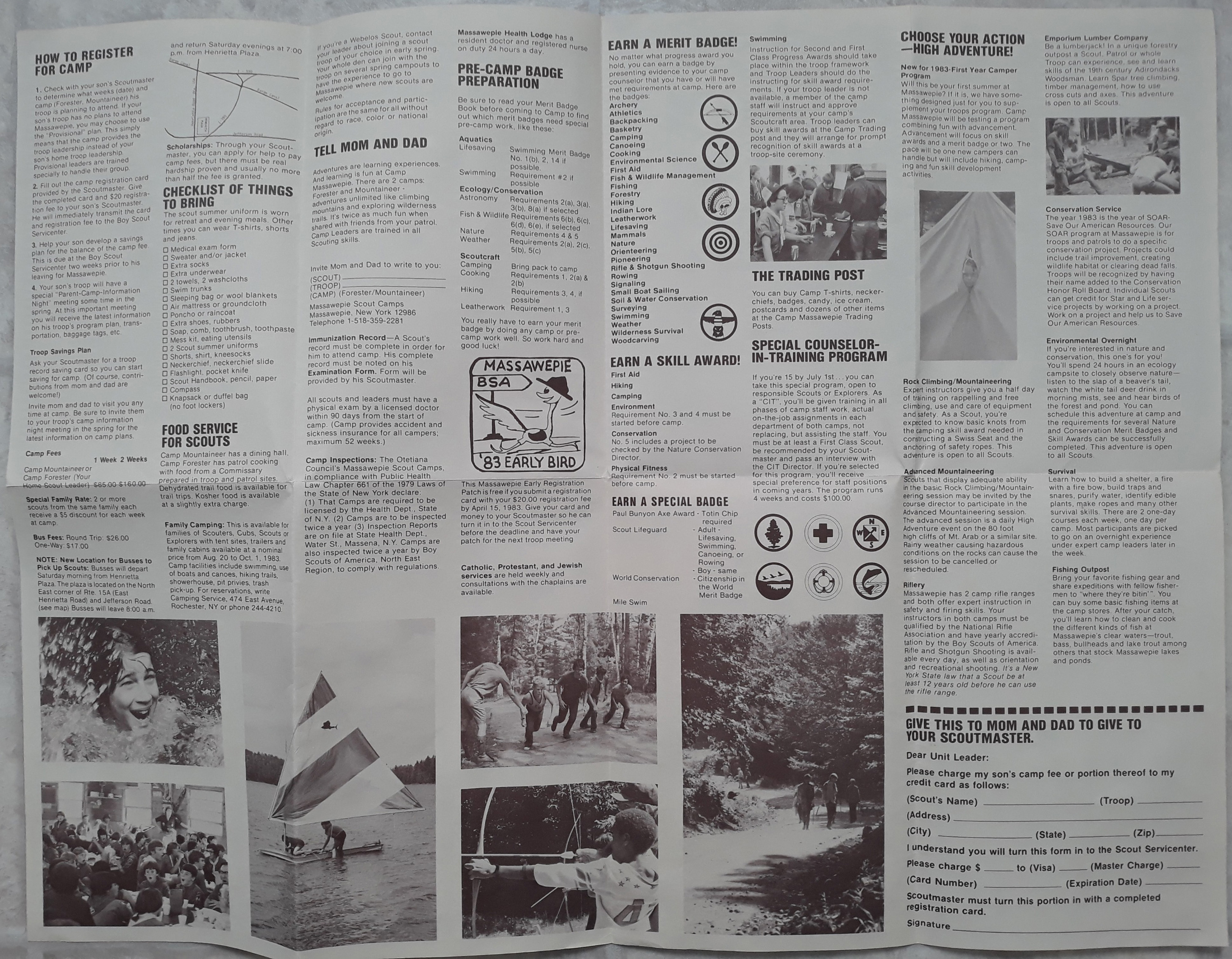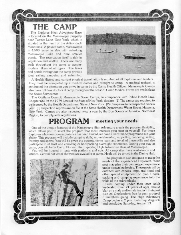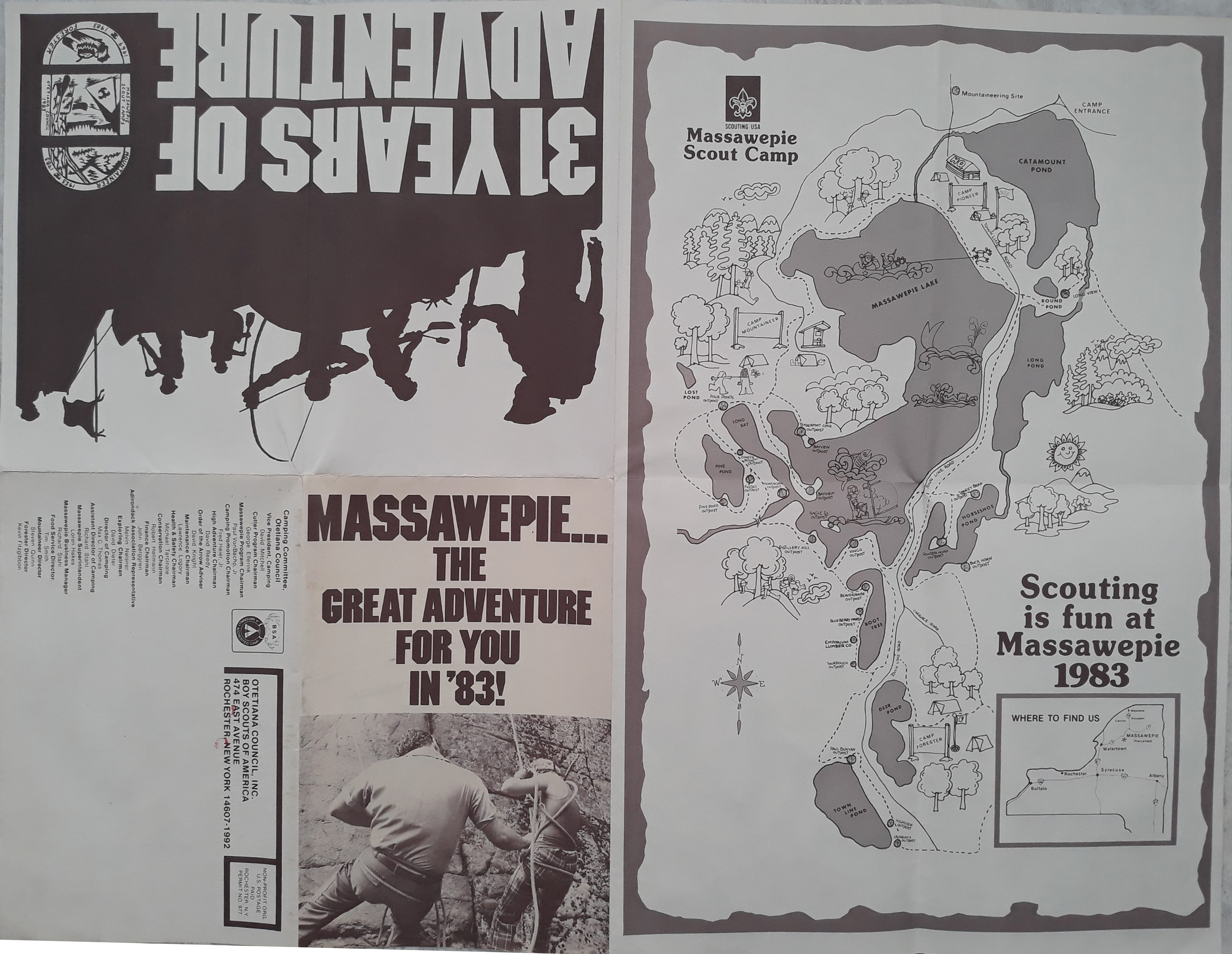 | 1983 Massawepie Promotional Flyer "31 Years of Adventure" Front Reverse | 1983 Explorer High Adventure Camp Flyer Page 1 Page 2 Page 3 Page 4 |