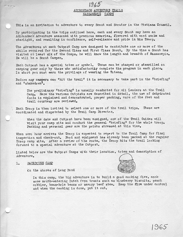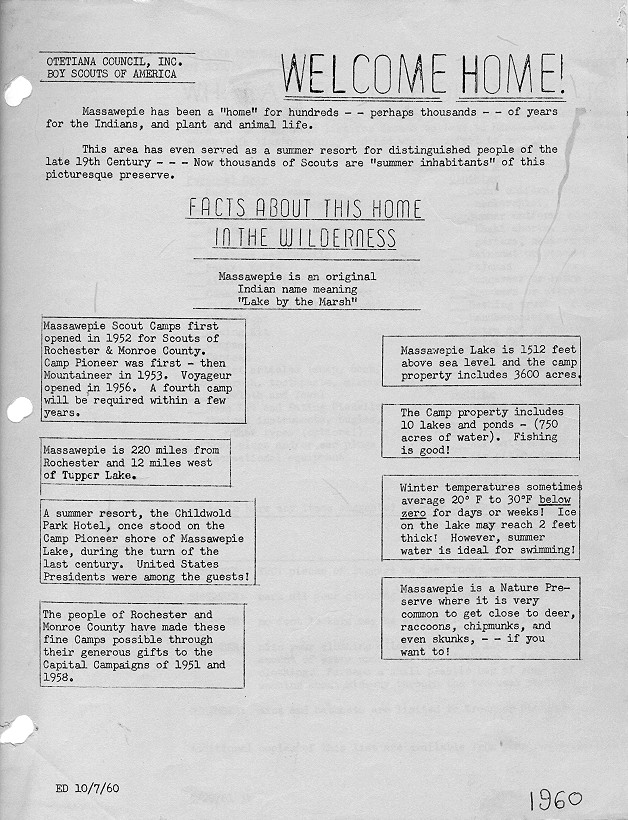 | Index of documents from 1952-1959 (including development of Massawepie's first three camps, and the Capital Campaign of 1958) | 1960 "Facts About This Home in the Wilderness" |