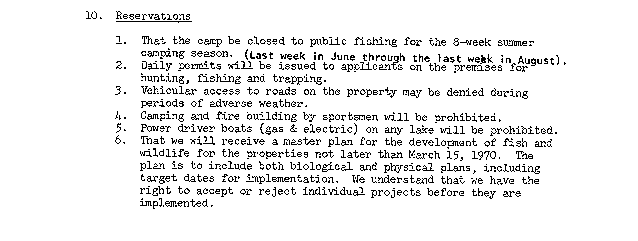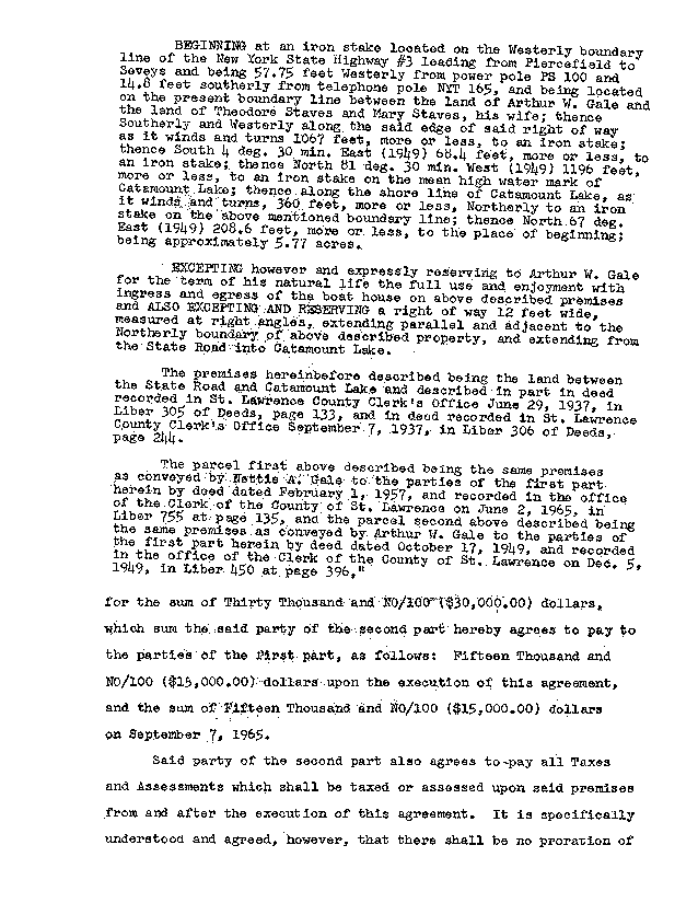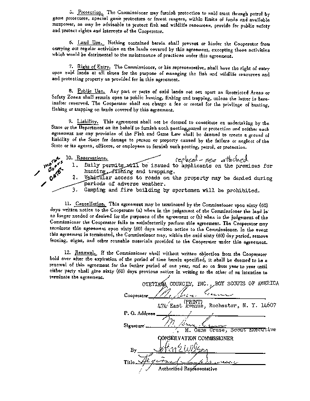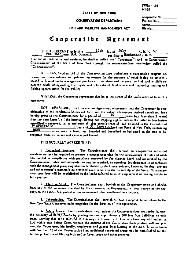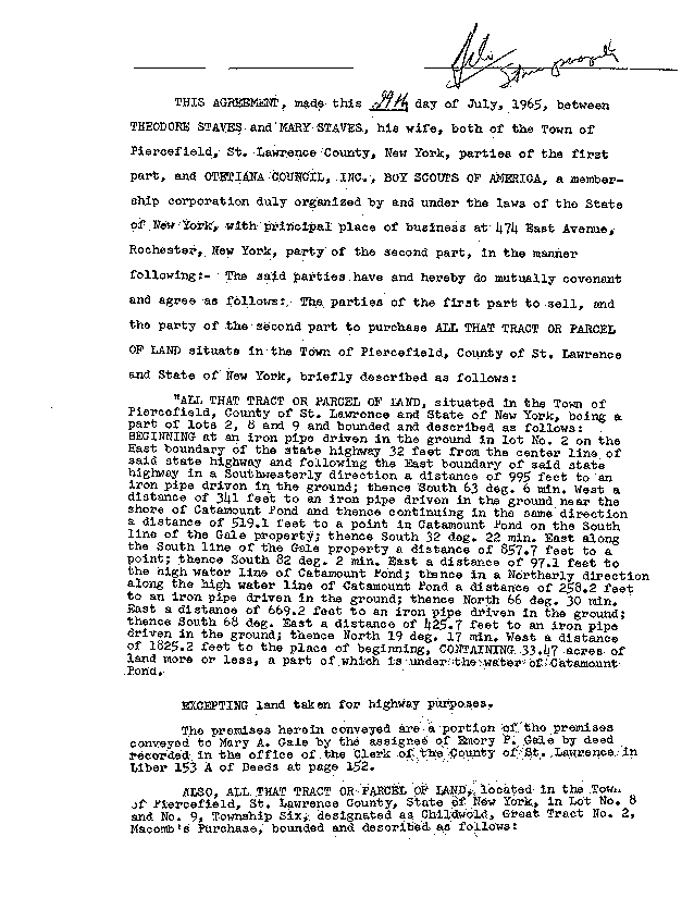 | 1965 Staves Property (& cabins, on Catamount Pond) Purchase Agreement Page 1 Page 2 Page 3 Page 4 Page 5 Page 6 | 1969 Cooperative Agreement with NYS Department of Conservation Page 1 Page 2 Page 3 |