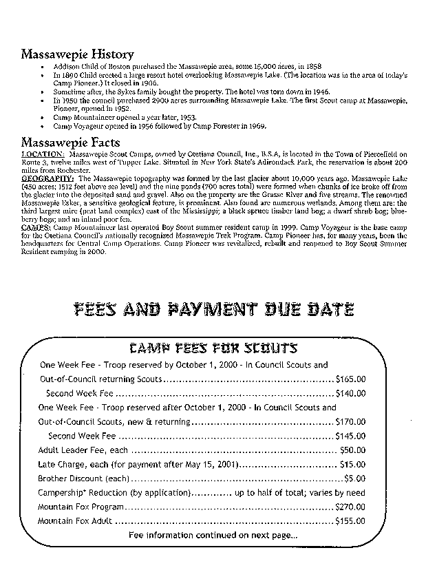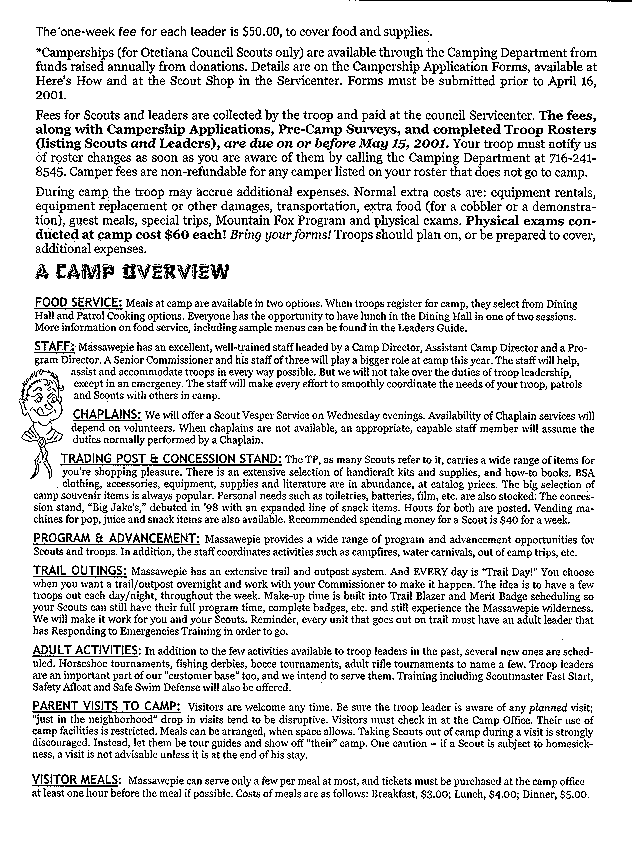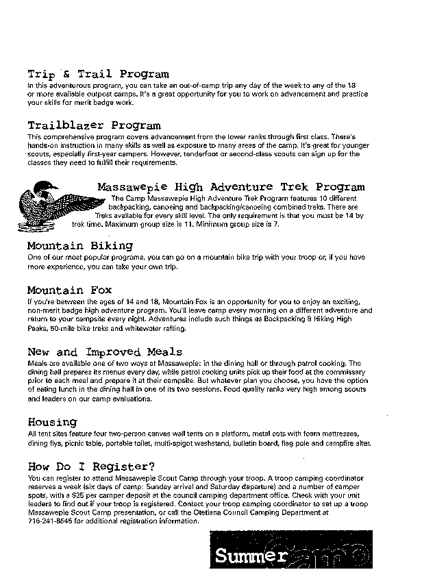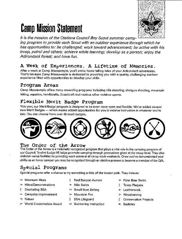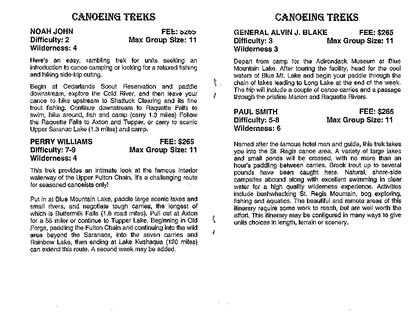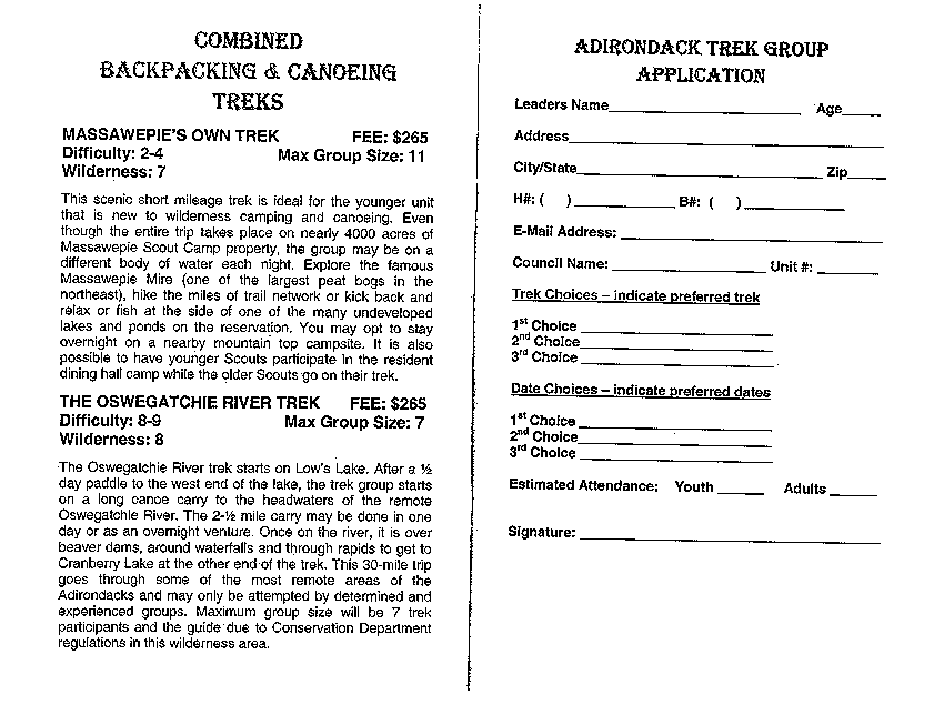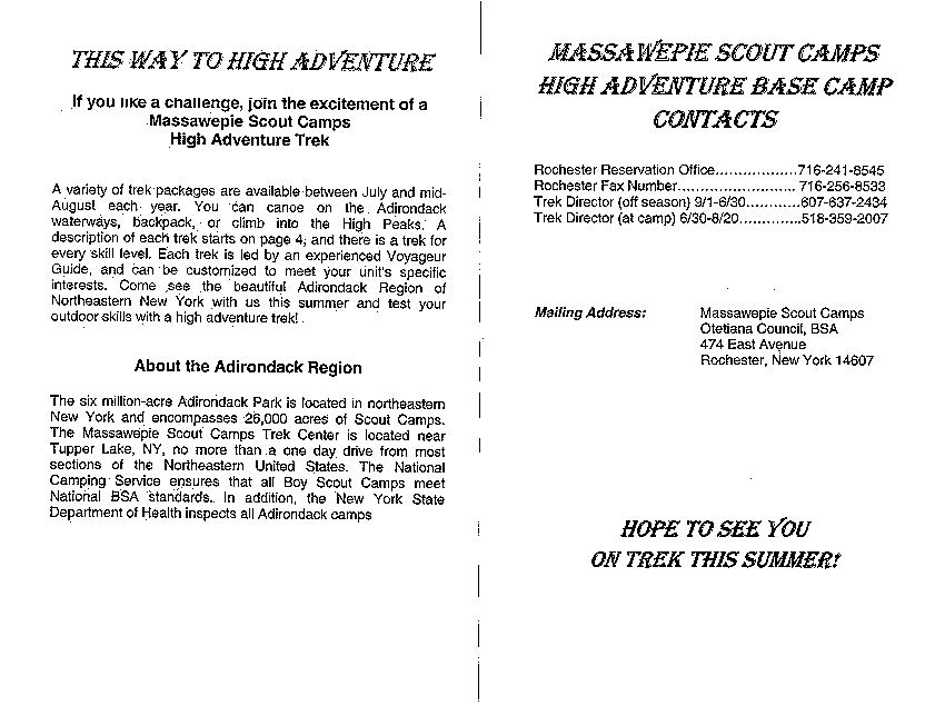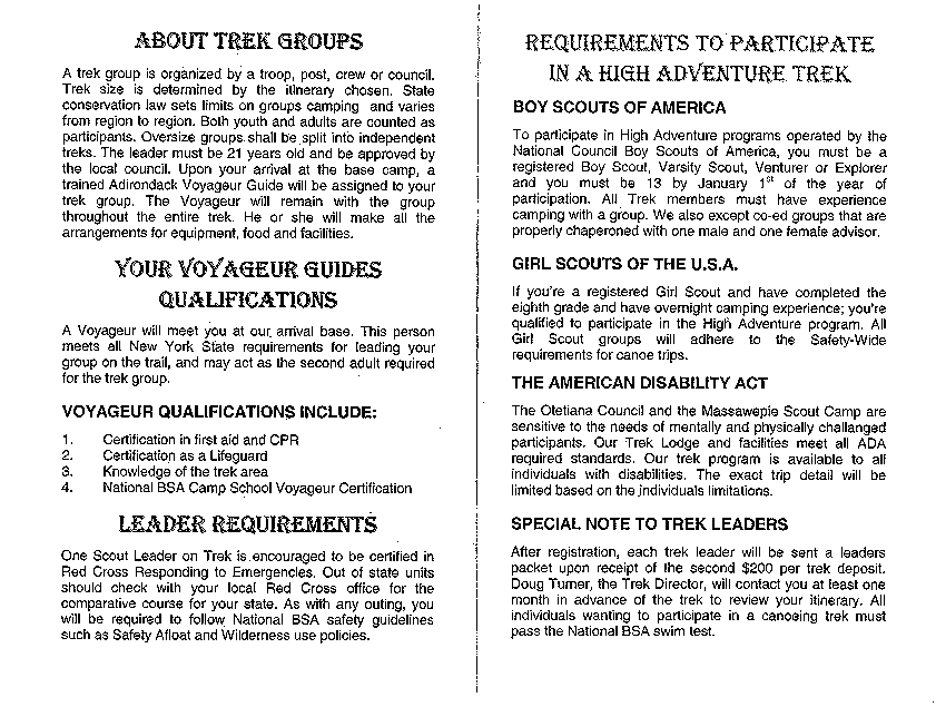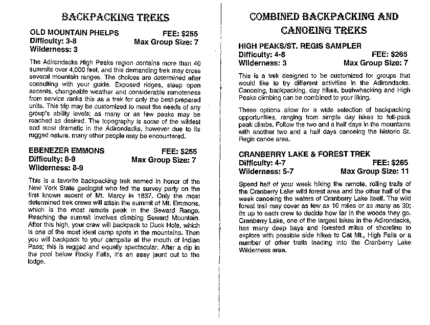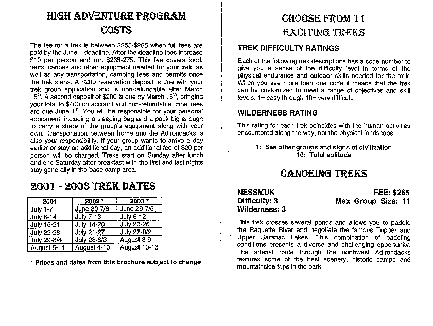 | 2001 Information for Parents: Page 1 Page 2 Page 3 Page 4 Page 5 Page 6 Page 7 Page 8 Page 9 | 2001 Adirondack High Adventure Trek Brochure: Page 1 Page 2 Page 3 Page 4 Page 5 Page 6 Page 7 |